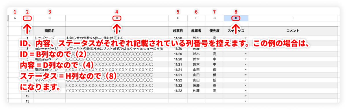 今回は以下のようなタスク表を想定し、特定の列が変更された場合にSlackへ通知を送るような仕組みを作ります。今回はステータスを管理する「H列」が任意のステータスに変更された場合に通知が飛ぶようにします。