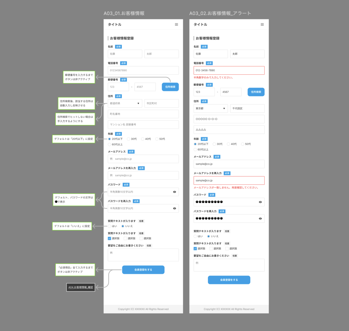 - ログイン:ログイン時は「ログイン」ボタンを非活性で表示、ログインに必要な項目を入力後に「ログイン」ボタンを活性で表示。ボタンの色や入力項目のエラーも明記します。